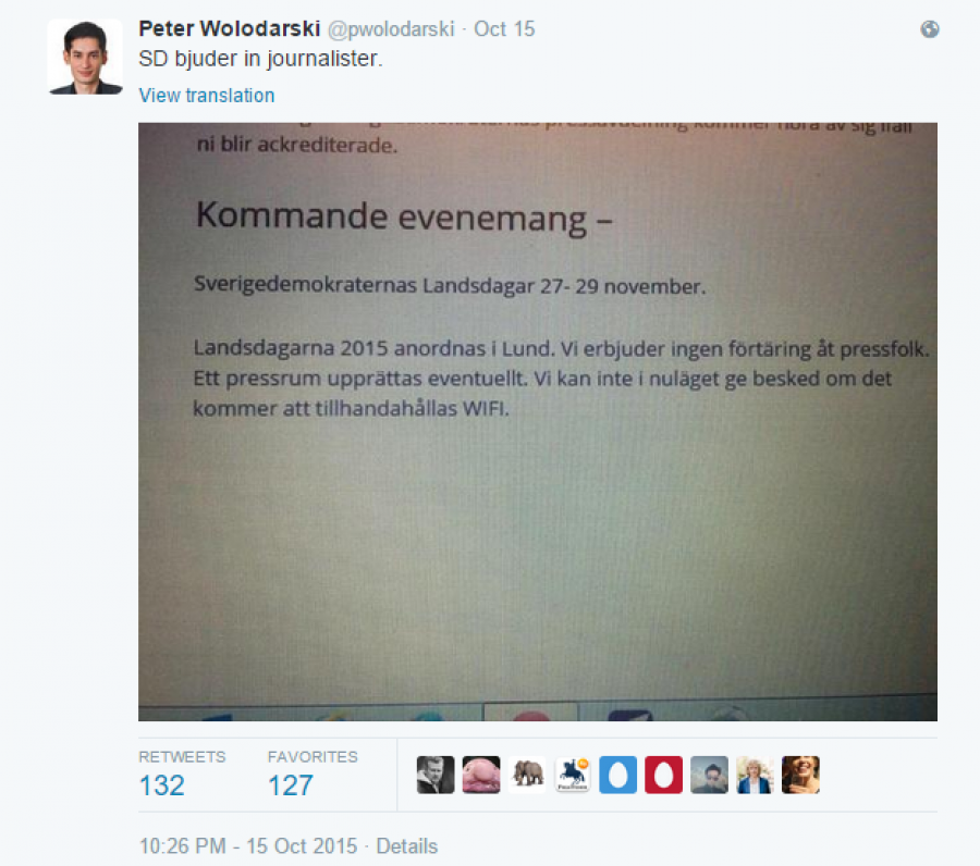 "Vi erbjuder ingen förtäring åt pressfolk", skrev Sverigedemokraterna i sin inbjudan till partistämman Landsdagarna senare i höst. Nu uppmärksammar DN:s chefredaktör Peter Wolodarski hur partiet vägrar erbjuda gratis mat åt journalistkåren.